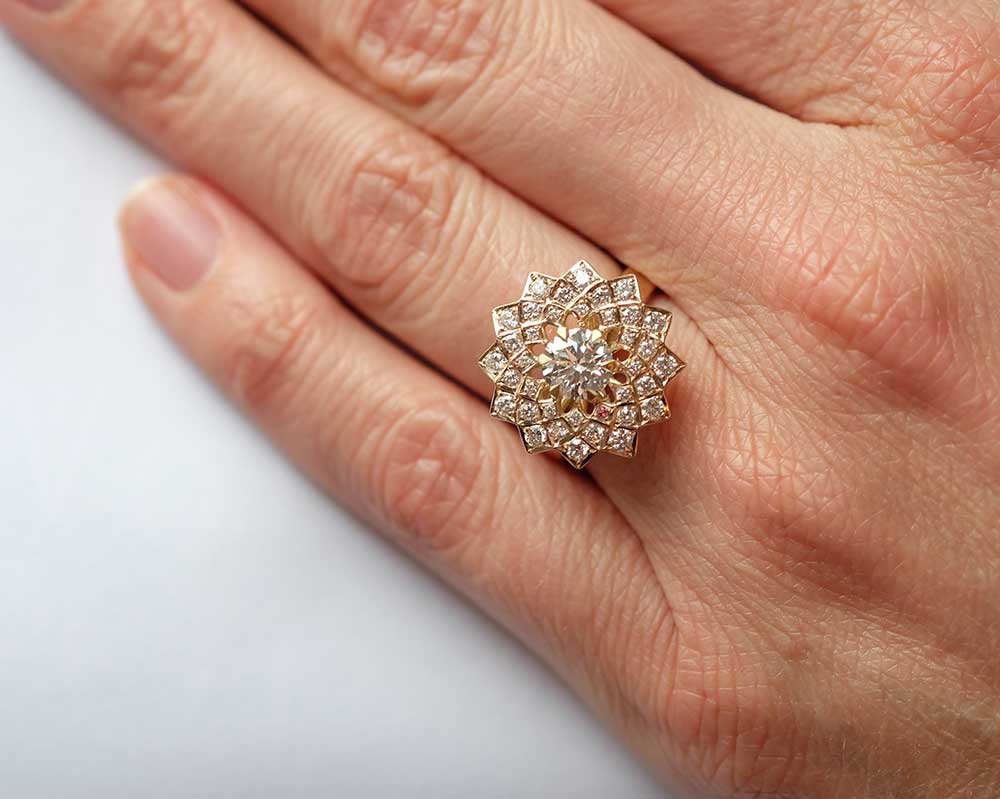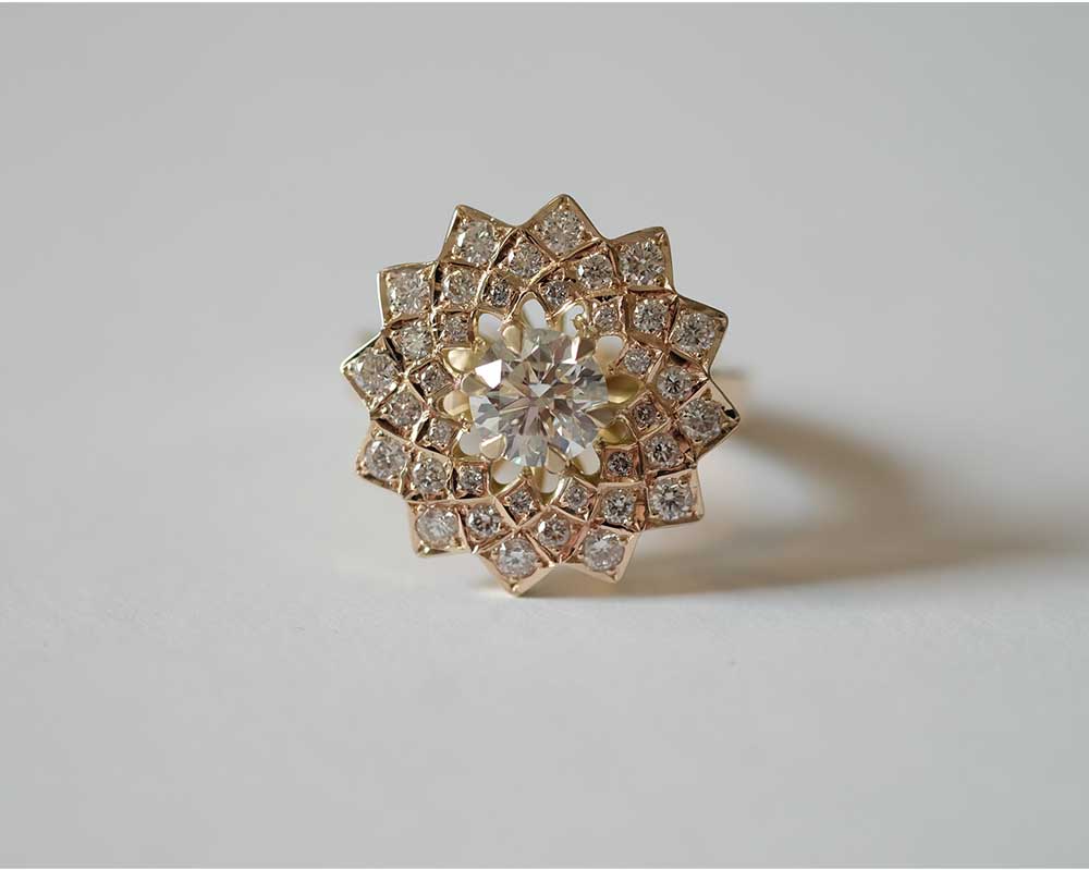 We designed this beautiful ring to have a series of graphic petal-like shapes coming from a central diamond.