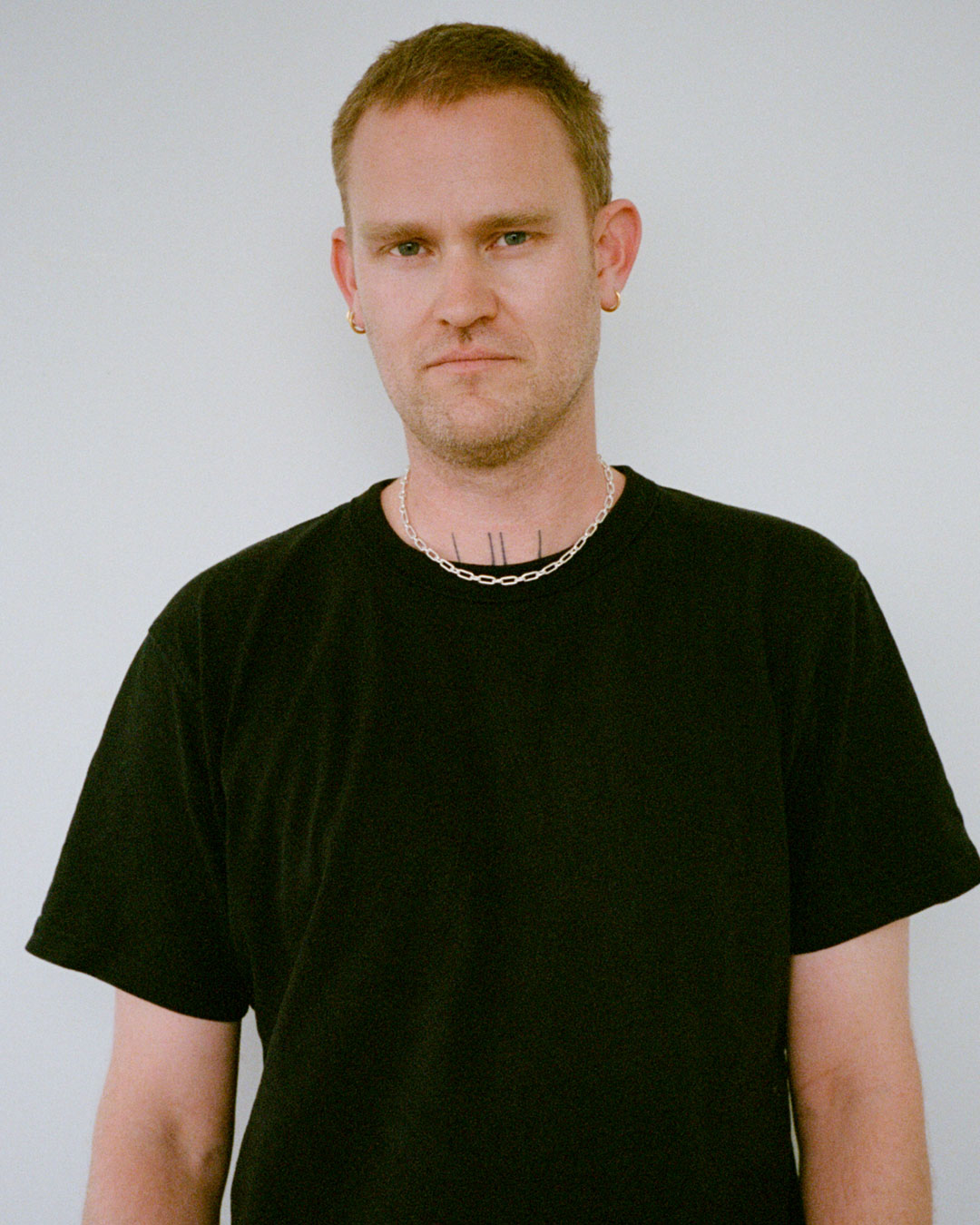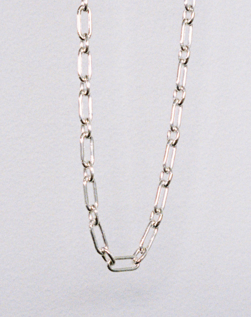 Hamish is wearing the Figaro Paperclip Necklace.