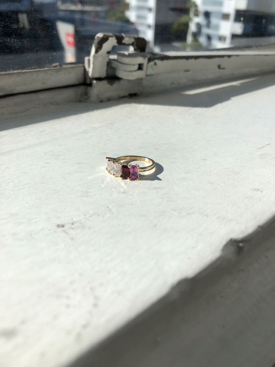 We spent a long time sourcing the perfect stones, all radiant cut, with three white diamonds, a red spinel and a pink sapphire