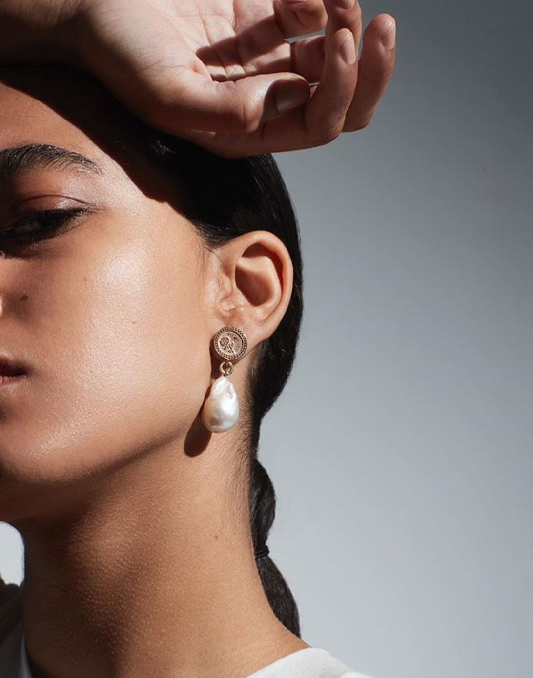 The Amulet pearl drops are a mismatched pair, one featuring a rose, the other a dove.
