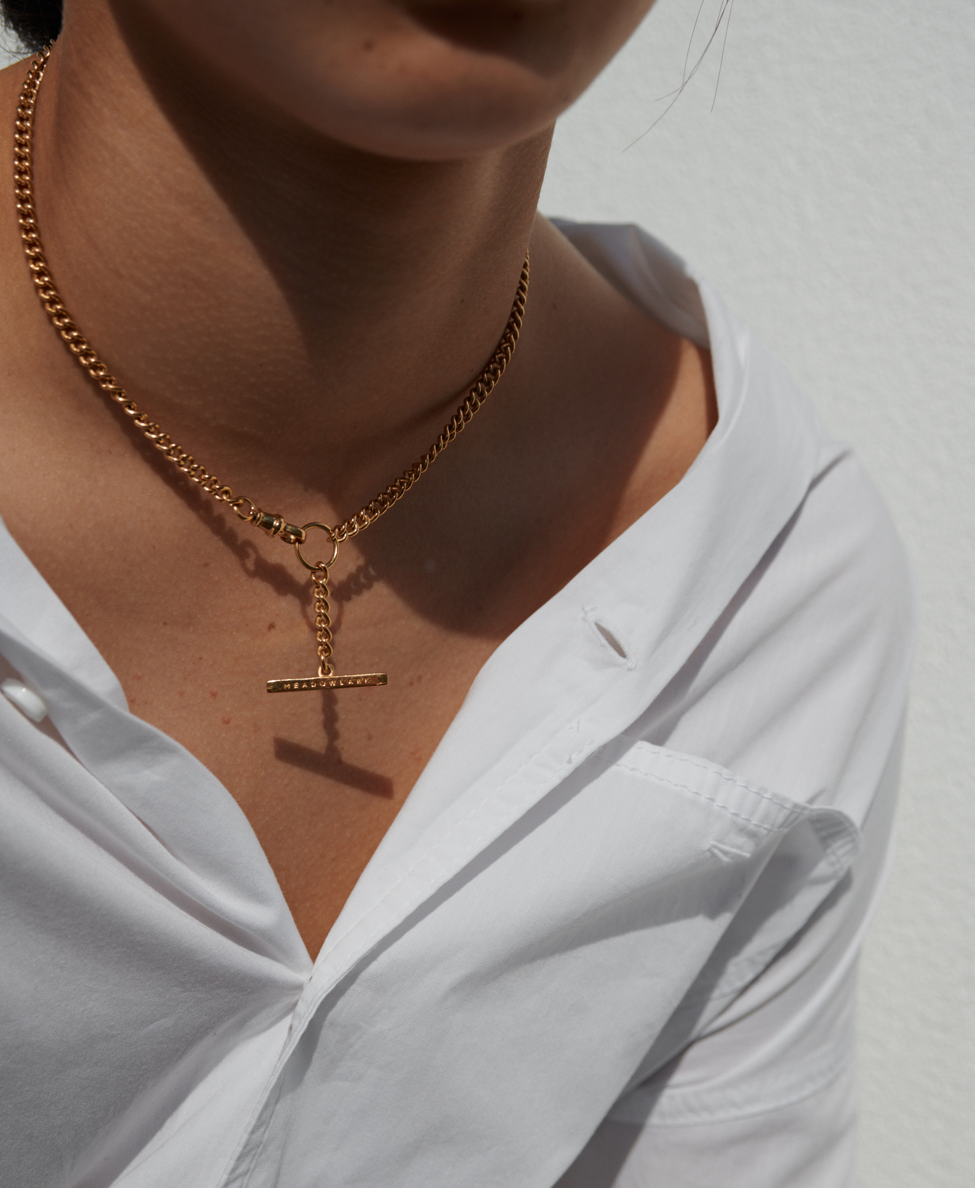 Fast-forward to the luxury of the 80s and this is channeled through the refined yet bold form of the stamped Fob-chain closure. Writ large and holding centre stage in an anklet, bracelet, and a necklace, on a string of freshwater pearls or in gleaming metal.