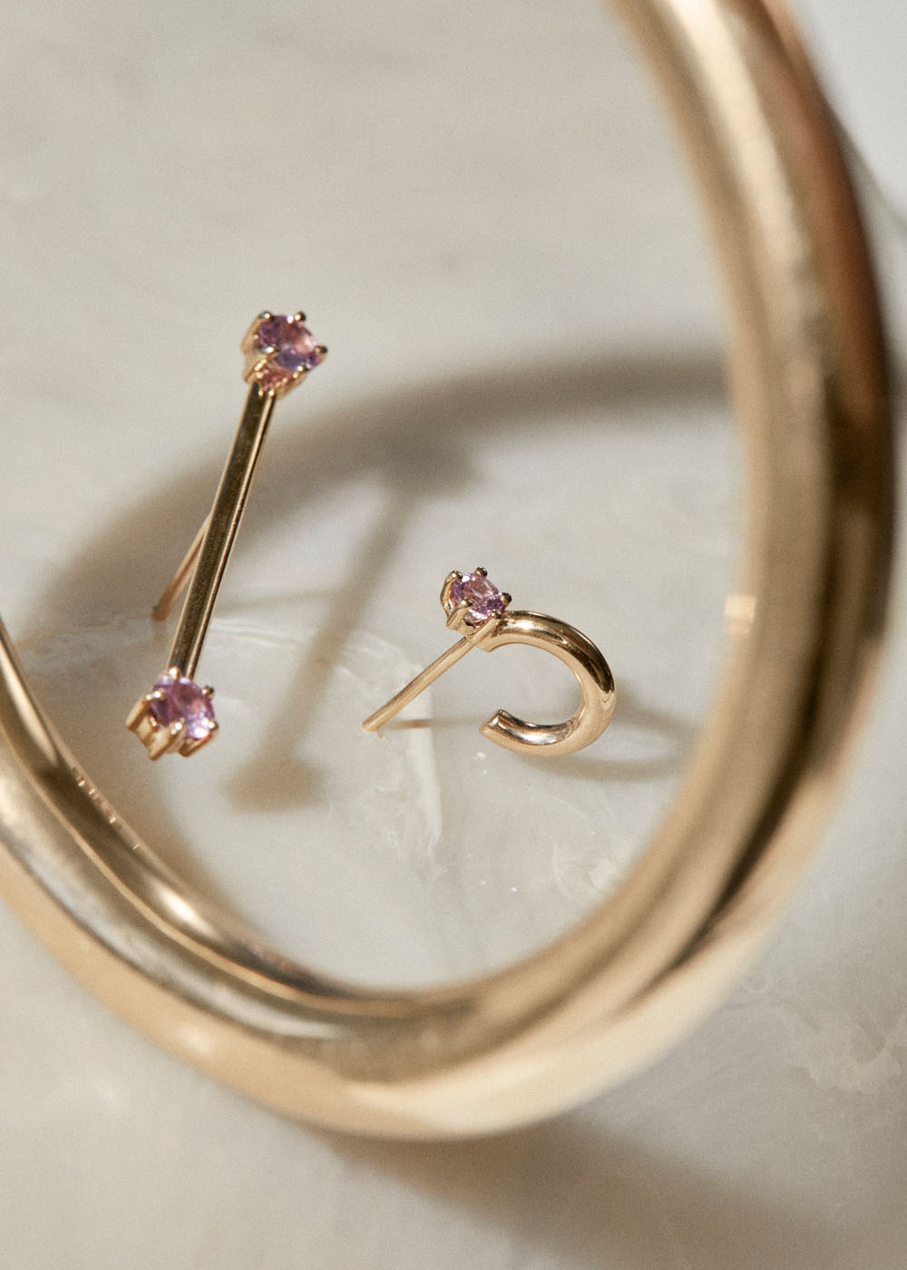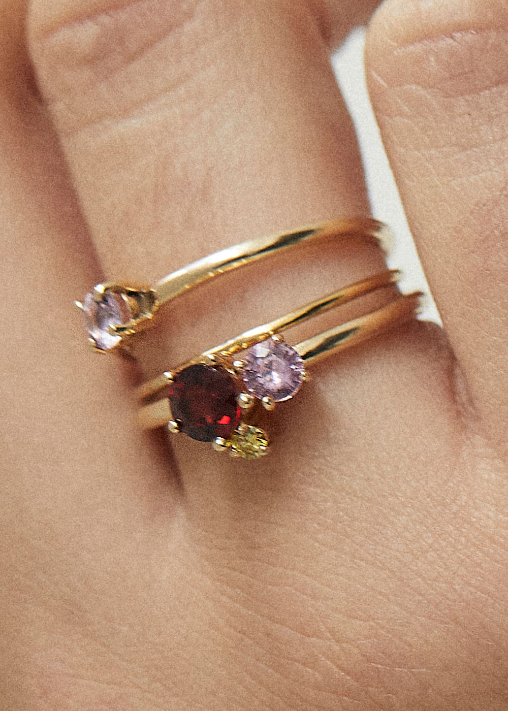 The rich red garnets and sapphires in hues of pink & yellow are set in a series of delicate designs – including the Trio Ring, Bisous Cluster & Drop Earrings.