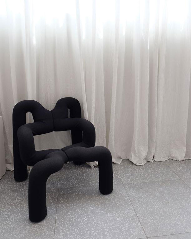 The black chair in our store is a vintage chair from the 1980s by a Norwegian designer and pioneer of norwegian postmodernism. The chair was designed in 1972 for design company Stokke and used in Star Trek: Voyager episode “caretaker”. Although unusual in shape, the Ekstrom chair is super comfortable and supportive to sit on, we invite you to come by and try it for yourself!