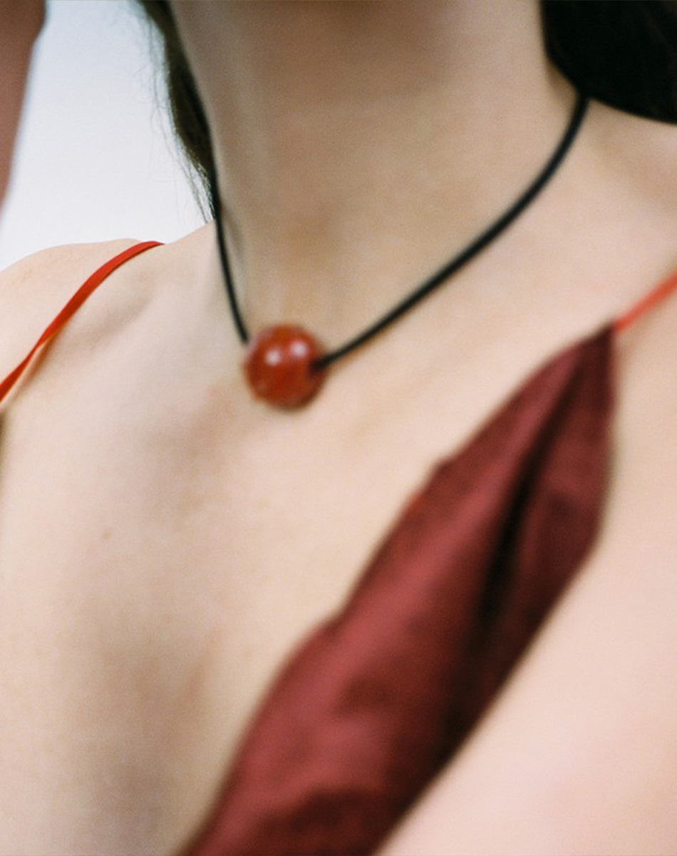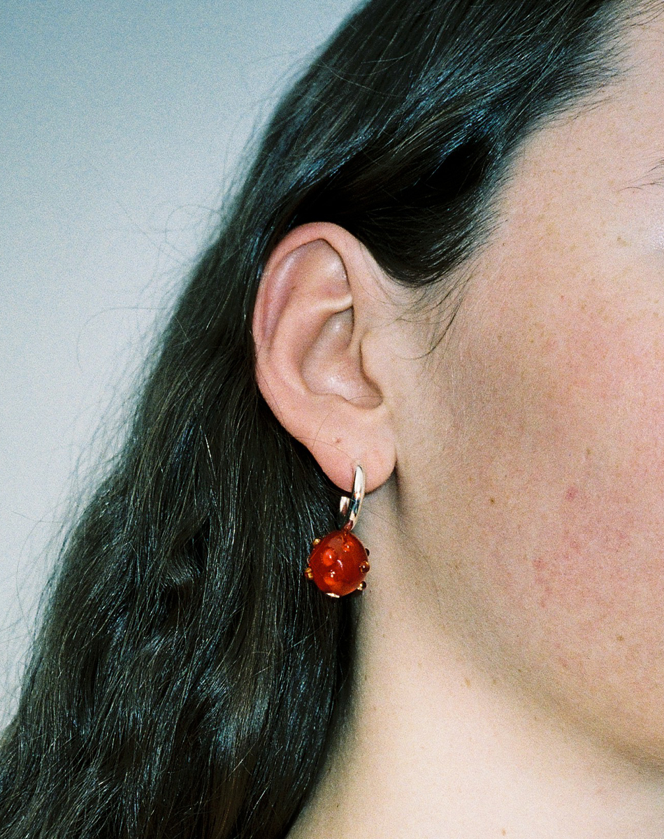 Inspired by our Anemone designs, a textural glass orb is suspended from cord and hoops, floating against the body like its own little planet.