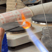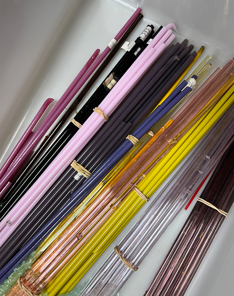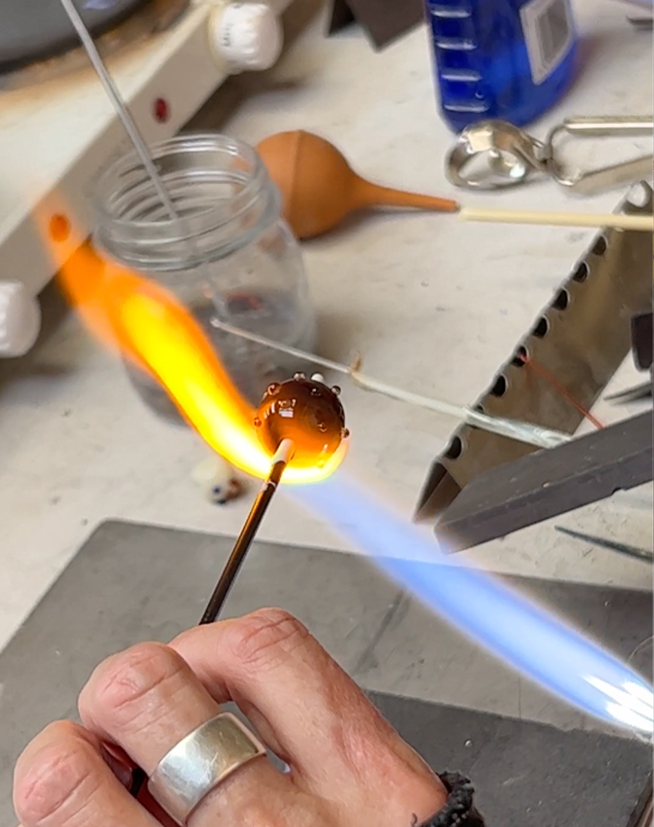 We first selected colours from an array of glass rods (which, once melted down don't always look like the colour of the original rod)! They were then heated and melted around a steel rod, turning to form the spherical shape. The little dots are blobbed on during this process.